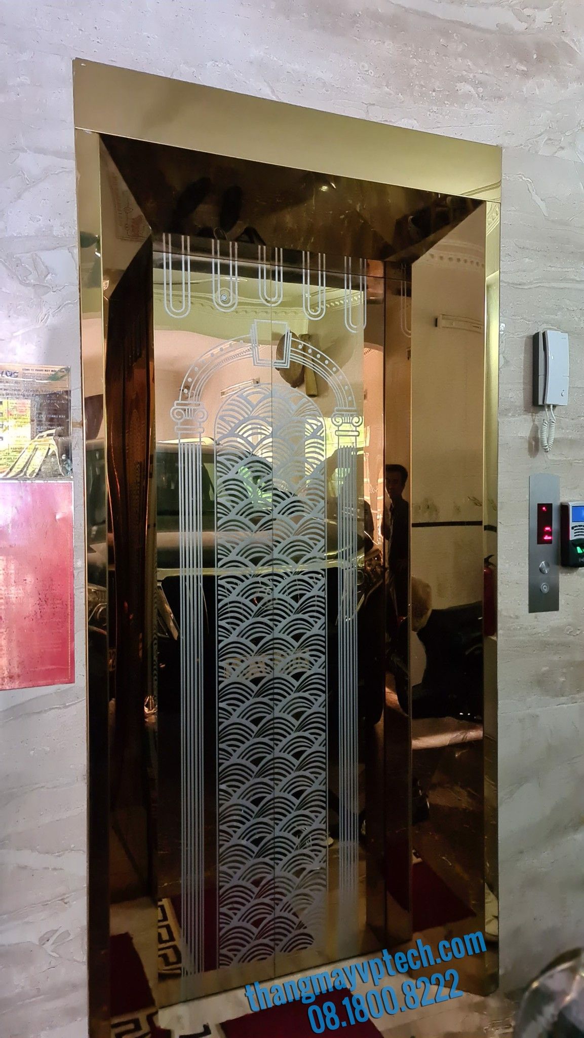 Chất liệu, hoa văn cửa tầng: Inox bóng gương, inox ăn món hoa văn, thép cường lực vàng/trắng, thép cường lực vàng/trắng, inox mờ vàng/trắng, kính cường lực, khung nhôm/thép.